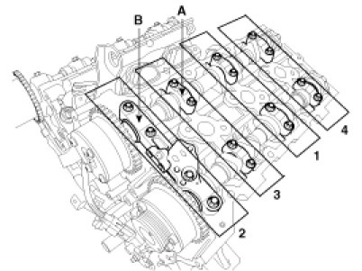 Install the LH/RH camshaft bearing cap (A) and thrust bearing cap (B).