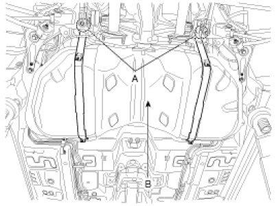 14. Remove the fuel tank (B) from the vehicle after removing the mounting nuts (A).