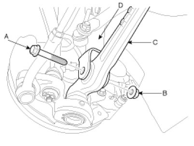 3. Disconnect the lateral arm (C) with the front strut assembly (D) by loosening the flange bolts (A) & lock nuts (B).