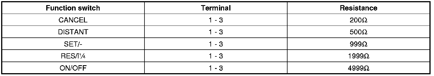 2. Measure resistance between terminals on the control switch when each function switch is ON (switch is depressed).