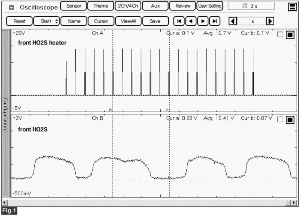 Fig.1) The signal waveforms of front HO2S(the upper) and heater(the lower) at idle