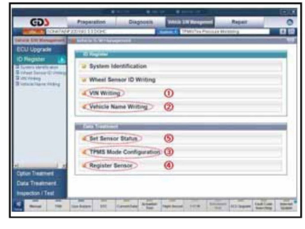 See GDS section for procedures for registering sensors, setting sensor status, and setting TPMS mode configuration.