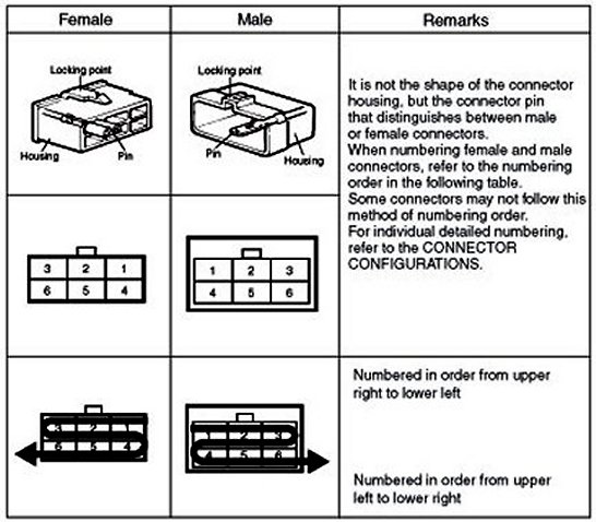 - It shows the front of the connector on the harness side when not to the harness connector. The terminal number on each connector can be obtained by following the pattern used in (5) connector view and numbering order. Unused terminals are marked with an asterisk (*).