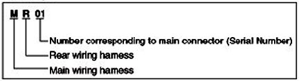 A Connector identification symbol consists of a wiring harness location classification symbol corresponding to a wiring harness location and number corresponding to the connector.
