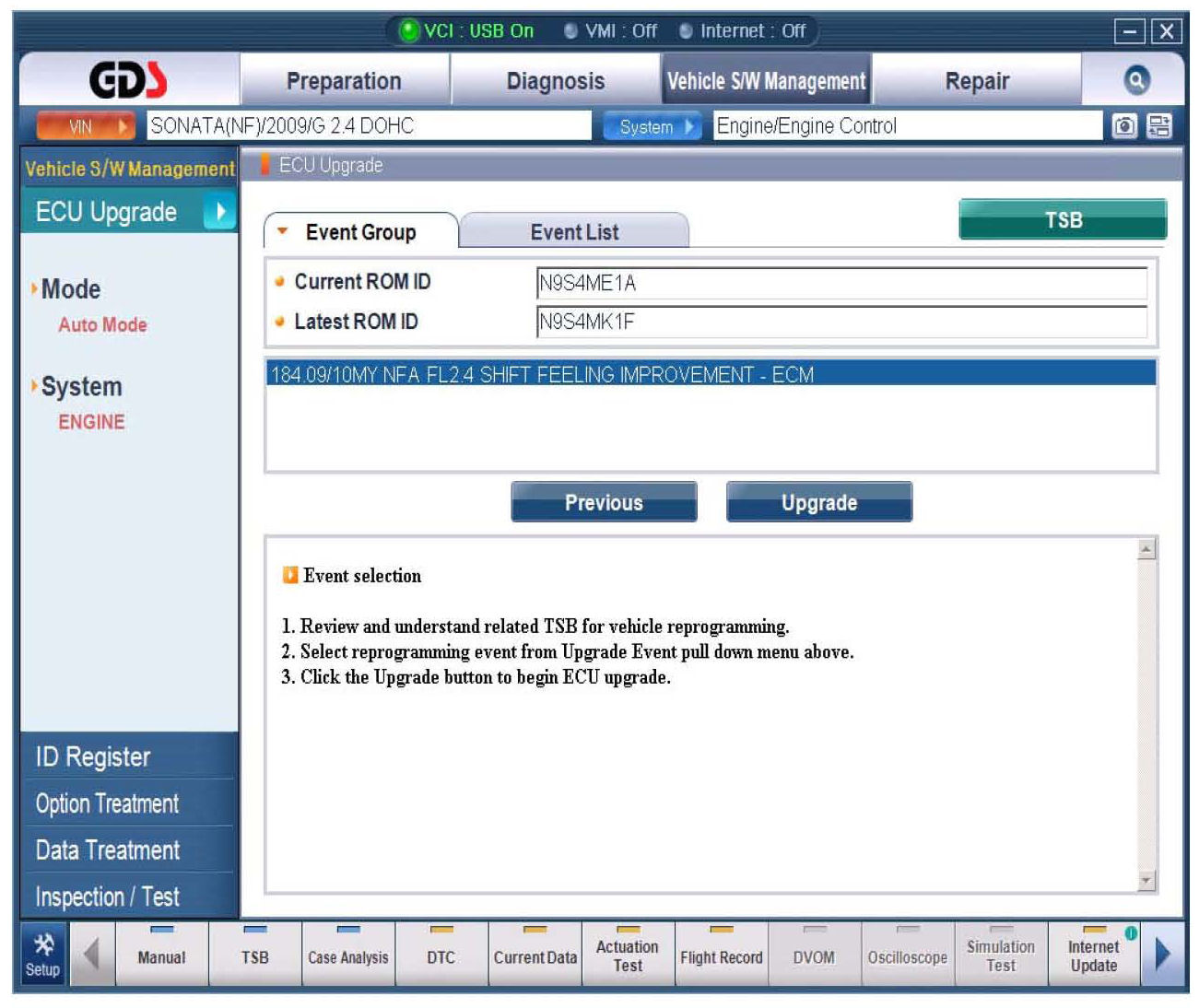 5. Select update event 185 O9IIOMY NFA FL2.4 Shift Feeling Improvement - TCM or any later (higher) event number that shows in the GDS list. Select Upgrade.