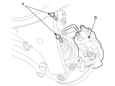 2. Remove the caliper assembly (A) from knuckle (B) and suspend it with wire.