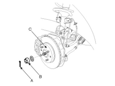 3. Remove the split pin (A), castle nut (B) and washer from the front hub assembly(C).