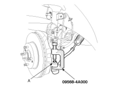 5. Disconnect the tie rod end ball joint (A) from the knuckle using a special tool (09568 - 4A000).