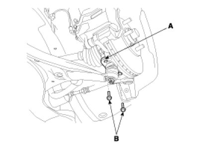 6. Remove the ball joint assembly mounting bolt (A) from the knuckle.