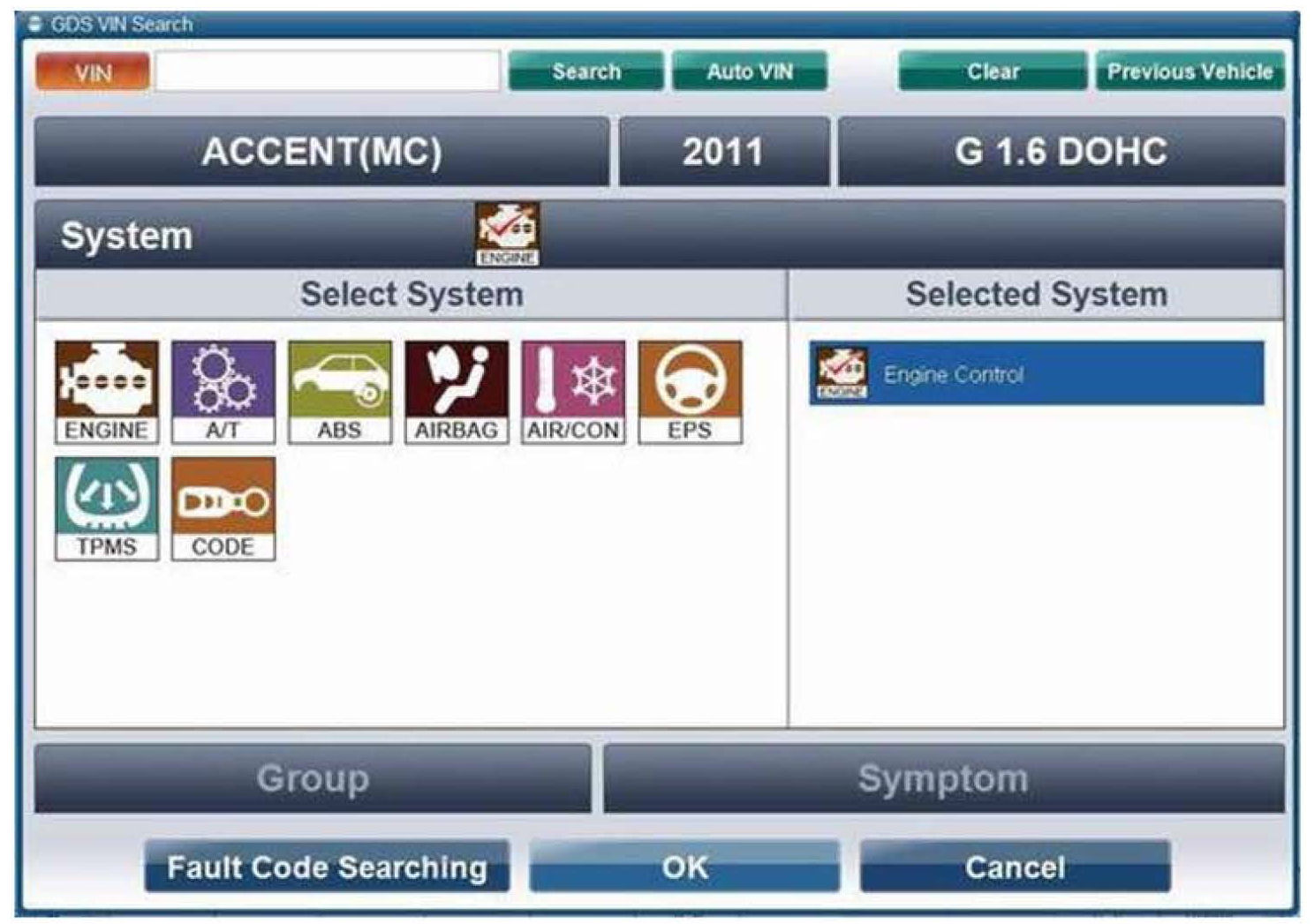 2. Enter the vehicle information by pressing the VIN Auto Detect button, entering the vehicle's VIN or selecting the vehicle model, model year, engine/fuel type and ENGINE as the system and then click OK.