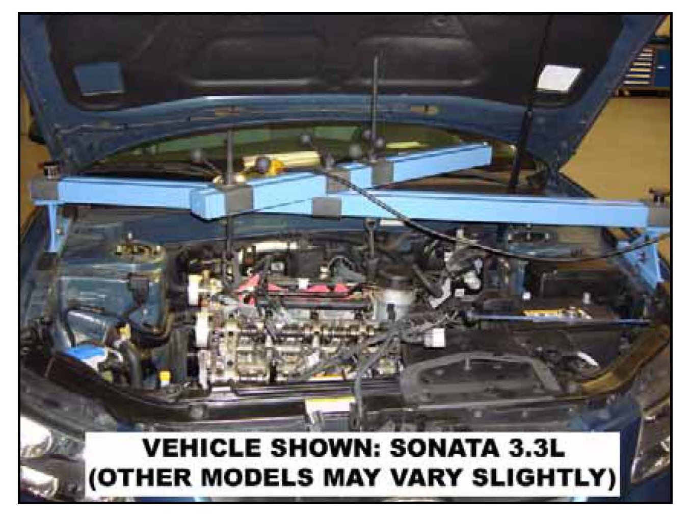 23. Sonata and Azera ONLY: Lift the engine until the RH upper mounting deck of engine is level with the corner of the RH strut tower.