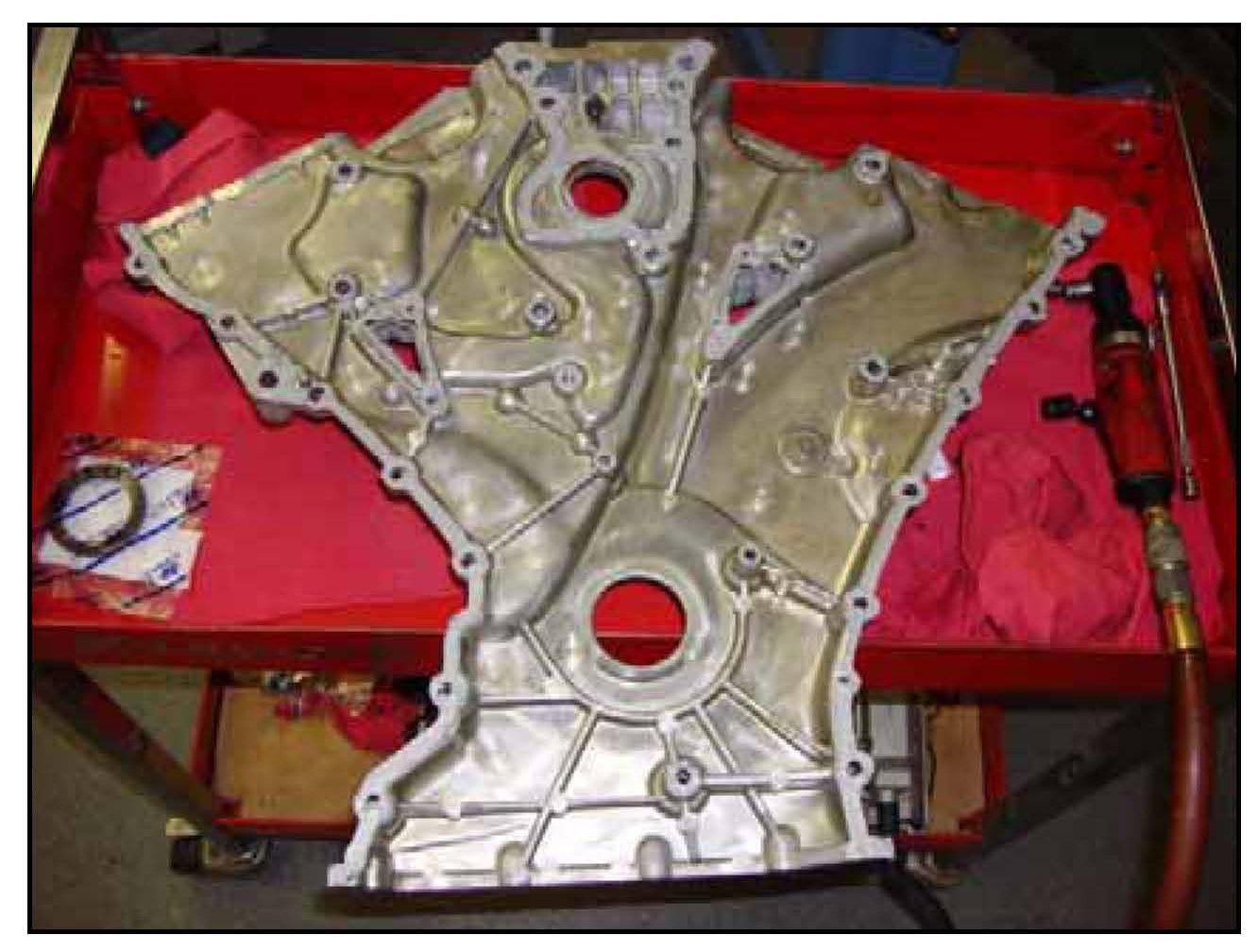 38. Carefully locate the timing chain cover into position and then attach to the engine.