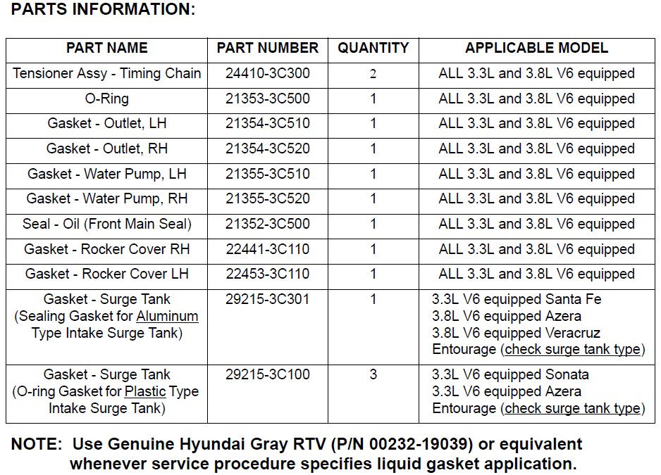 For the applicable vehicles equipped with 3.3L and 3.8L V6 engines listed below, this bulletin outlines the revised service procedure to improve serviceability for the removal and replacement of both LH/RH timing chain tensioners. The new procedure does not require that the engine be removed from the vehicle. Accordingly, the updated warranty information has been included.