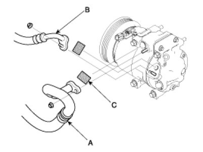 5. Remove the bolts, then disconnect the suction line (A) and discharge line (B) from the compressor. Plug (C) or cap the lines immediately after disconnecting them to avoid moisture and dust contamination.