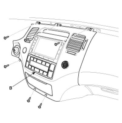 5. Loosen the screw. Remove the center facia panel (A) and then disconnect the connectors.