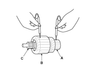 8. Check with an ohmmeter that no continuity exists between the commutator (A) and armature coil core (B), and between the commutator and armature shaft (C). If continuity exists, replace the armature.