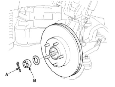 5. Remove the split pin(A) and driveshaft castle nut(B) from the front hub.