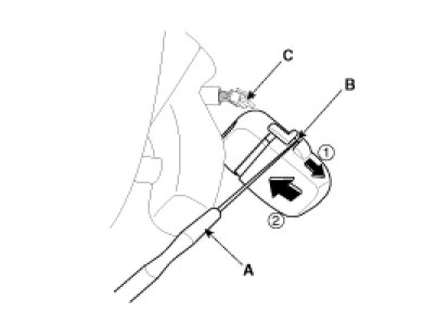 1. Remove the rain sensor cover first. Be careful not to damage the cover latch by applying excessive force. To remove the latch, pull aside the latch using the cover hole (B) with a small slotted (-) screwdriver (A).
