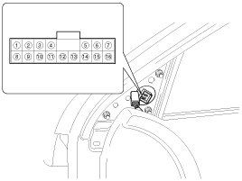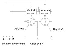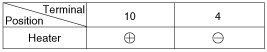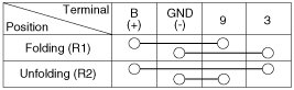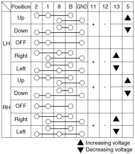 3. Apply battery voltage to each terminal as shown in the table and verify that the mirror operates properly.