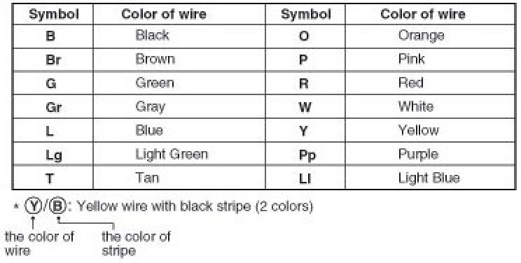 The following abbreviations are used to identify wire colors in the circuit schematics.