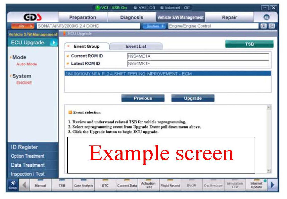 2. Within the ECU Upgrade screen, select ENGINE, Manual Mode, and then select the Upgrade Event: "225.UD 1.8 P0106, P0605 DTC LOGIC IMPROVEMENT." or any later (higher) event number that shows in the GDS list for any other issue.