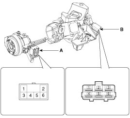 1. Disconnect the ignition switch connector (B) and key warning switch connector (A) from the steering column.