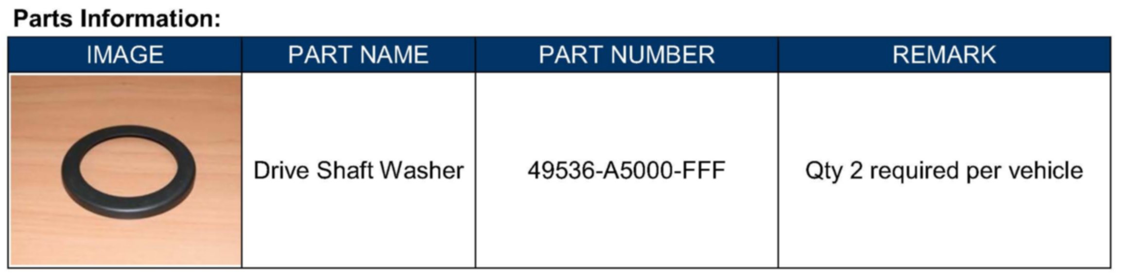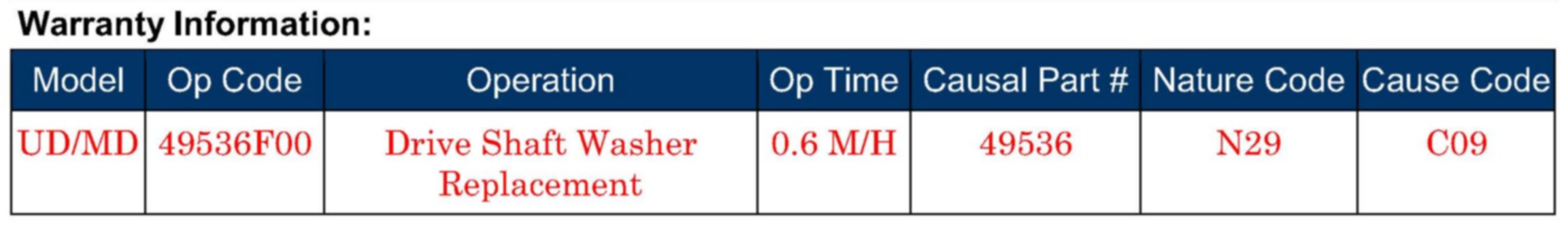 Some customers may describe a slight creaking or popping noise when accelerating forwards or reverse from a stop. This bulletin describes the service procedure to replace the drive shaft washers with revised parts.