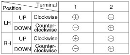 4. Connect the motor terminals directly to battery voltage (12V) and check that the motor operates smoothly. Next, reverse the polarity and check that the motor operates smoothly in the reverse direction. If the operation is abnormal, replace the motor.