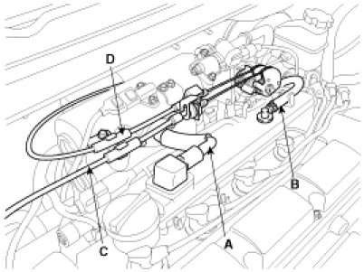 (3) Install the accelerator cable (C) and the auto-cruise cable (D) from the cylinder head cover.