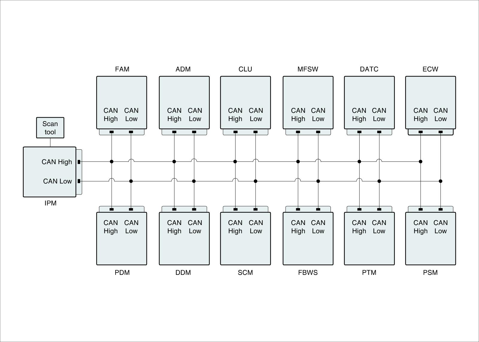 They are IPM (Inter Panel Module), FAM (Front Area Module), PDM (Power Distribution Module), DDM (Drive Door Module), ADM (Assist Door Module), ECW (Electronic Control Wiper), CLU (Cluster), MFSW (Multi Function Switch), PSM (Power Seat Module), SCM (Steering Control Module), PTM (Power Trunk Lid Module), FBWS (Front Back Warning System), DATC (Dual Auto Temperature Control Module).