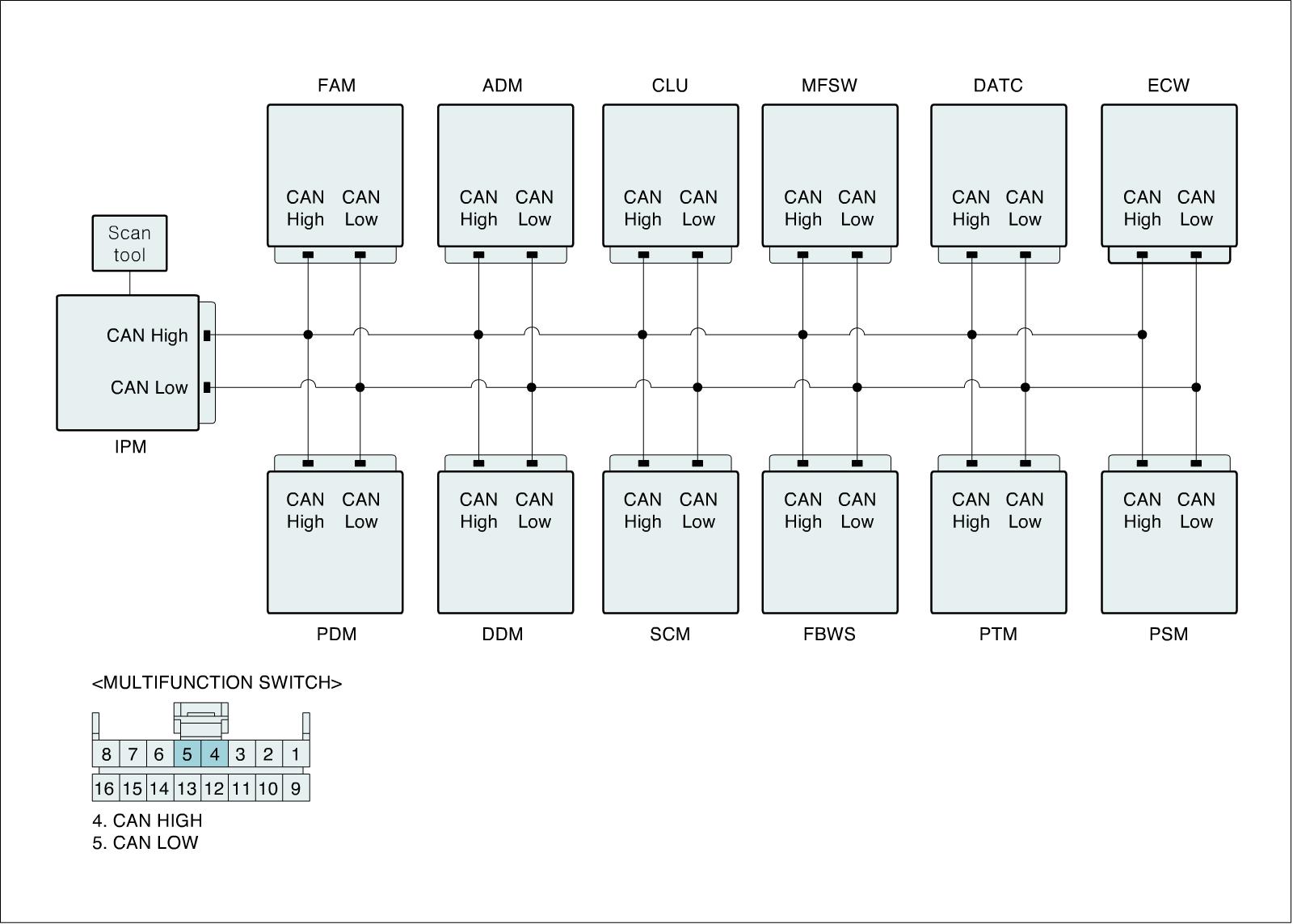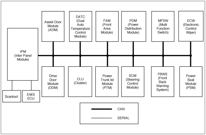 All 13 units which consists of the Body Electrical Control System are linked by CAN* line. They are IPM (Inter Panel Module), FAM (Front Area Module), PDM (Power Distribution Module), DDM (Drive Door Module), ADM (Assist Door Module), ECW (Electronic Control Wiper), CLU (Cluster), MFSW (Multi Function Switch), PSM (Power Seat Module), SCM (Steering Control Module), PTM (Power Trunk Lid Module), FBWS (Front Back Warning System), DATC (Dual Auto Temperature Control Module).
