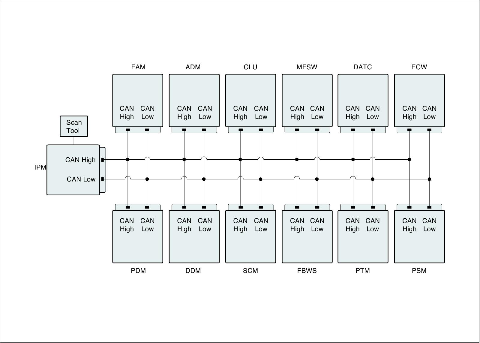 *CAN communication units : IPM (Inter Panel Module), FAM (Front Area Module), PDM (Power Distribution Module), DDM (Drive Door Module), ADM (Assist Door Module), ECW (Electronic Control Wiper), CLU (Cluster), MFSW (Multi Function Switch), PSM (Power Seat Module), SCM (Steering Control Module), PTM (Power Trunk Lid Module), FBWS (Front Back Warning System), DATC (Dual Auto Temperature Control Module)