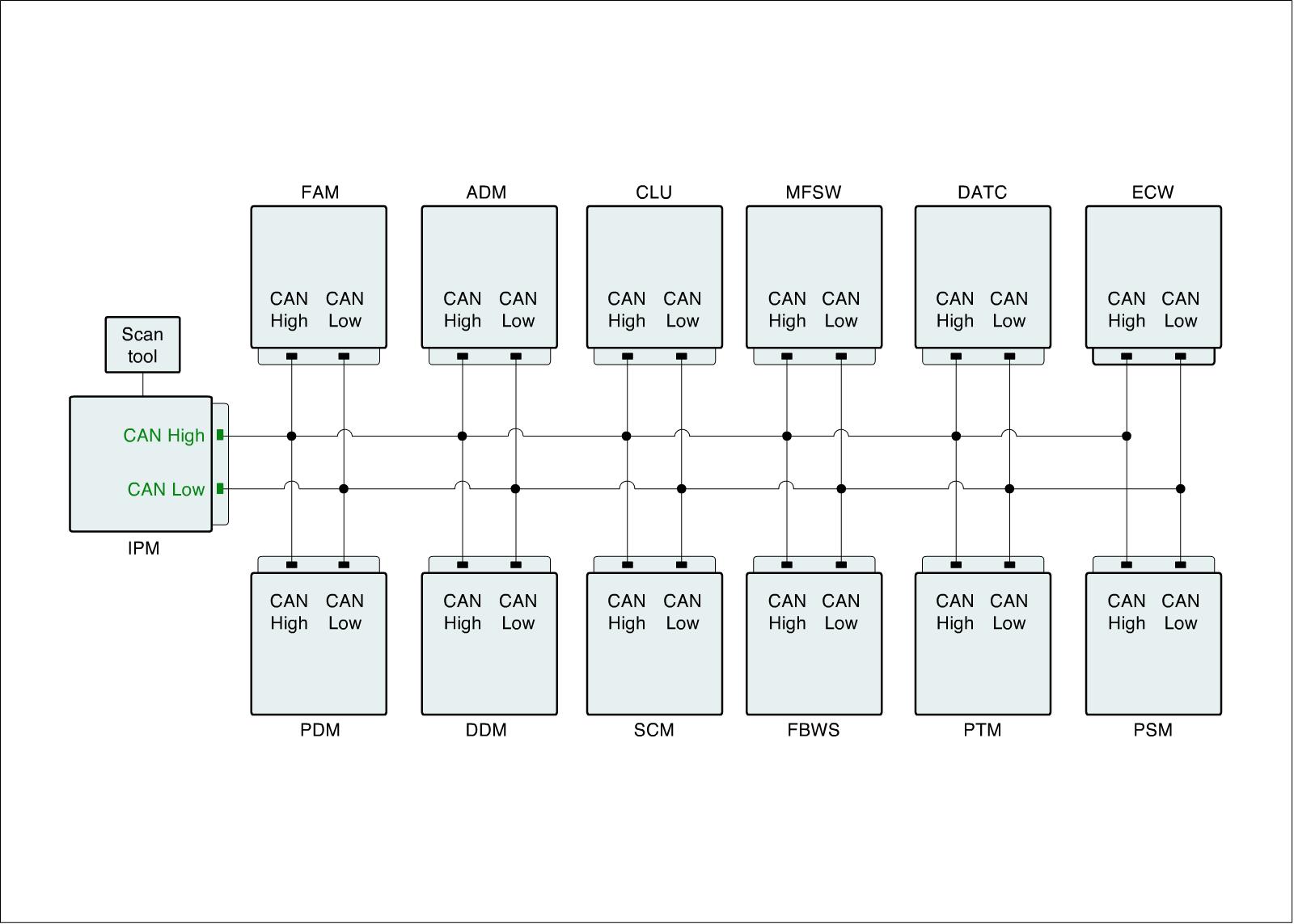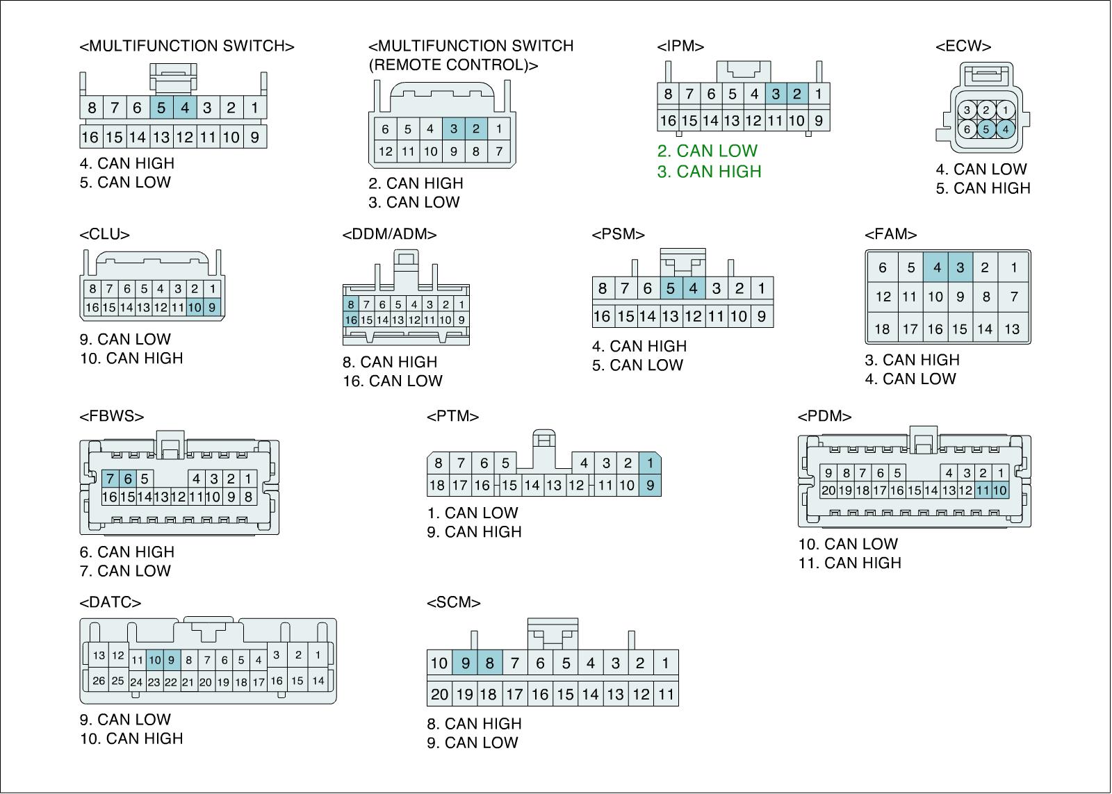 *CAN communication units : IPM (Inter Panel Module), FAM (Front Area Module), PDM (Power Distribution Module), DDM (Drive Door Module), ADM (Assist Door Module), ECW (Electronic Control Wiper), CLU (Cluster), MFSW (Multi Function Switch), PSM (Power Seat Module), SCM (Steering Control Module), PTM (Power Trunk Lid Module), FBWS (Front Back Warning System), DATC (Dual Auto Temperature Control Module)
