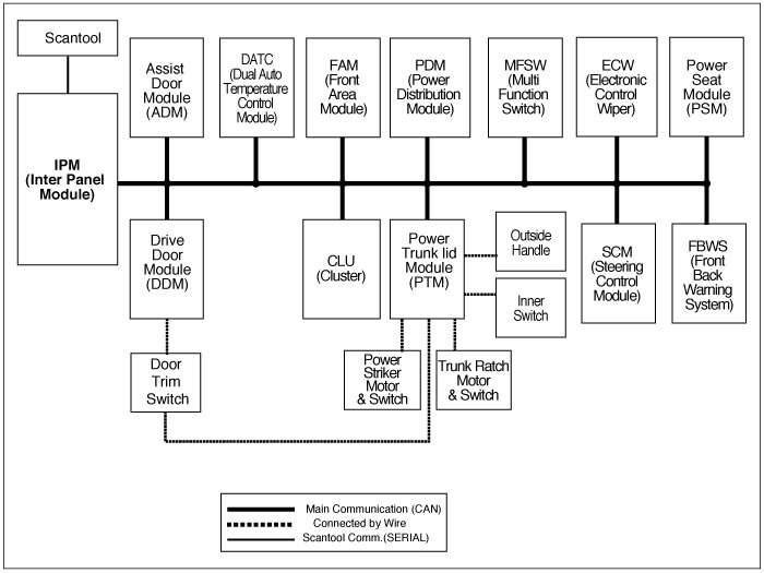 The motor of PTM (Power Trunk Lid Module) consists of Drive Motor, Trunk Latch Motor, and Power Striker Motor. Therefore, It is available to open trunk by mechanical power. Opening is controlled by Trunk Lid Outside Handle, Door Trim Pull Switch, or Remote Controller. Closing is controlled by Inner Switch or Door Trim Push Switch. Opening or closing the rid by mechanical power is performed by hinge's rotation which is controlled by rod (This rod is consists of Sector Gear linked to Drive Motor Gear).