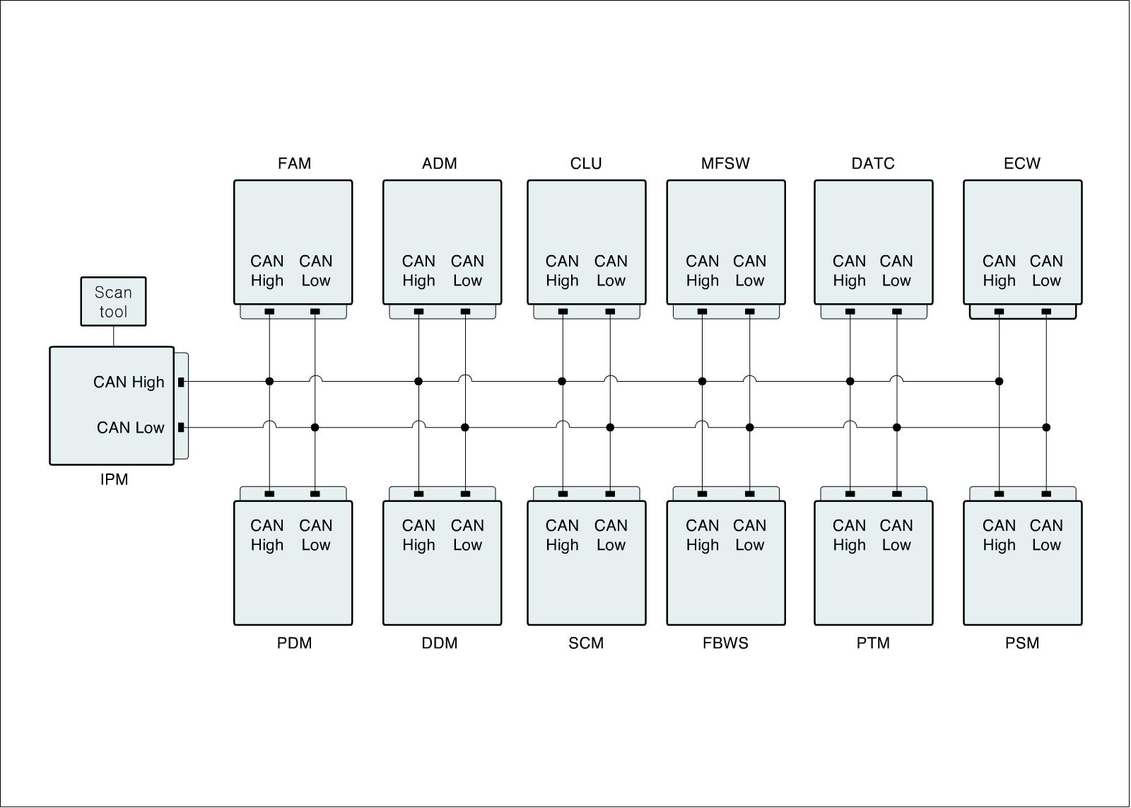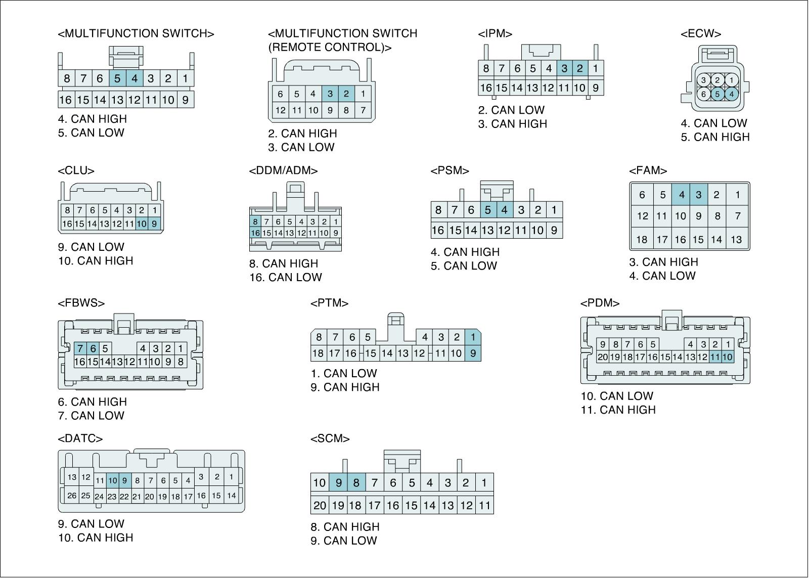 They are IPM (Inter Panel Module), FAM (Front Area Module), PDM (Power Distribution Module), DDM (Drive Door Module), ADM (Assist Door Module), ECW (Electronic Control Wiper), CLU (Cluster), MFSW (Multi Function Switch), PSM (Power Seat Module), SCM (Steering Control Module), PTM (Power Trunk Lid Module), FBWS (Front Back Warning System), DATC (Dual Auto Temperature Control Module).