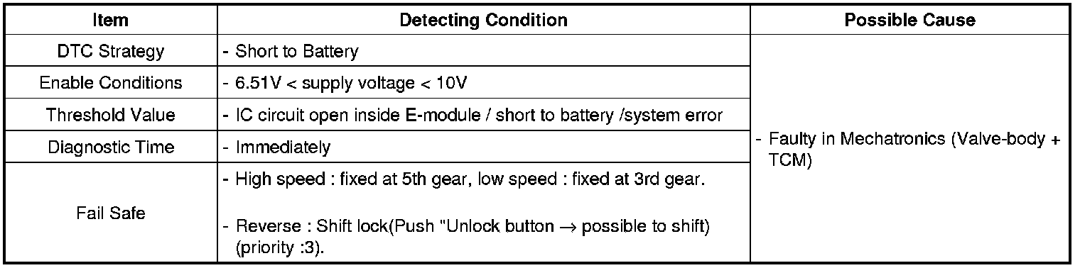 TCM set this code If detected ground short for IC circuit of Inhibitor s/w. (MIL ON : 2 driving Cycle)
