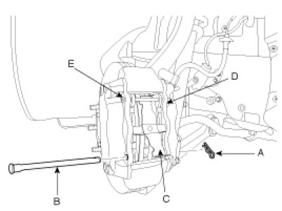 3. Loosen the hose eye-bolt (B) and caliper mounting bolts (C), then remove the front caliper assembly (A).