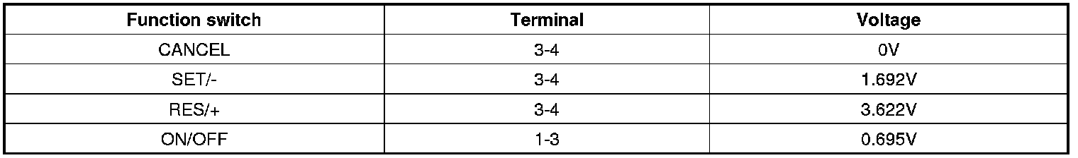 2. Measure voltage between terminals on the harness side connector when each function switch is ON (switch is depressed).