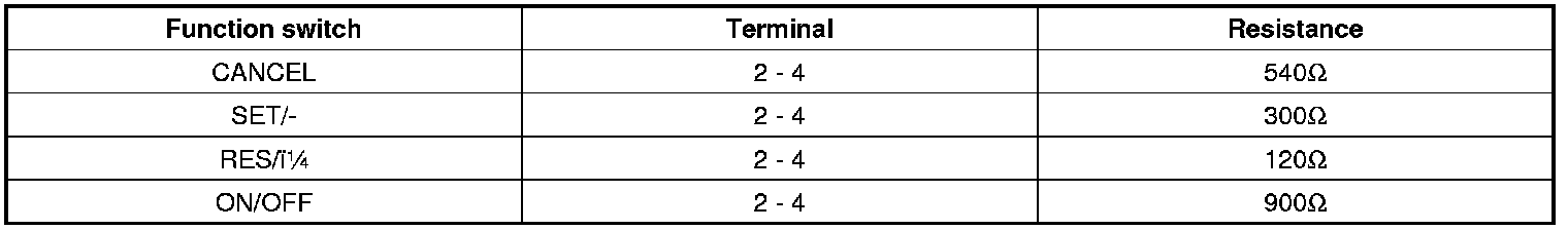 2. Measure resistance between terminals on the control switch when each function switch is ON (switch is depressed).