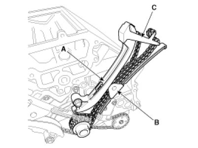 4. Install the timing chain with the timing chain tensioner arm (A) , the timing chain guide (B) and the timing chain locking tool (SST : 09231-2J600) (C).