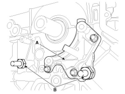 22. Remove the tensioner adapter (A) and the timing chain guide bolts (B).
