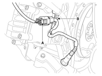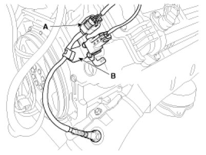 5. Disconnect the oxygen sensor (HO2S) connector (A) and remove the wiring bracket (B).