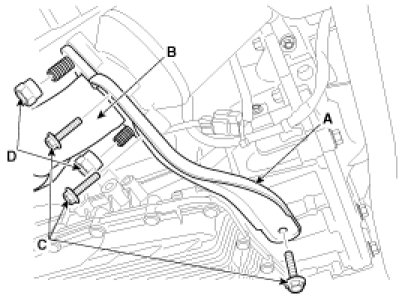4. Reconnect the oxygen sensor (HO2S) connector (A) and install the wiring connector bracket (B).