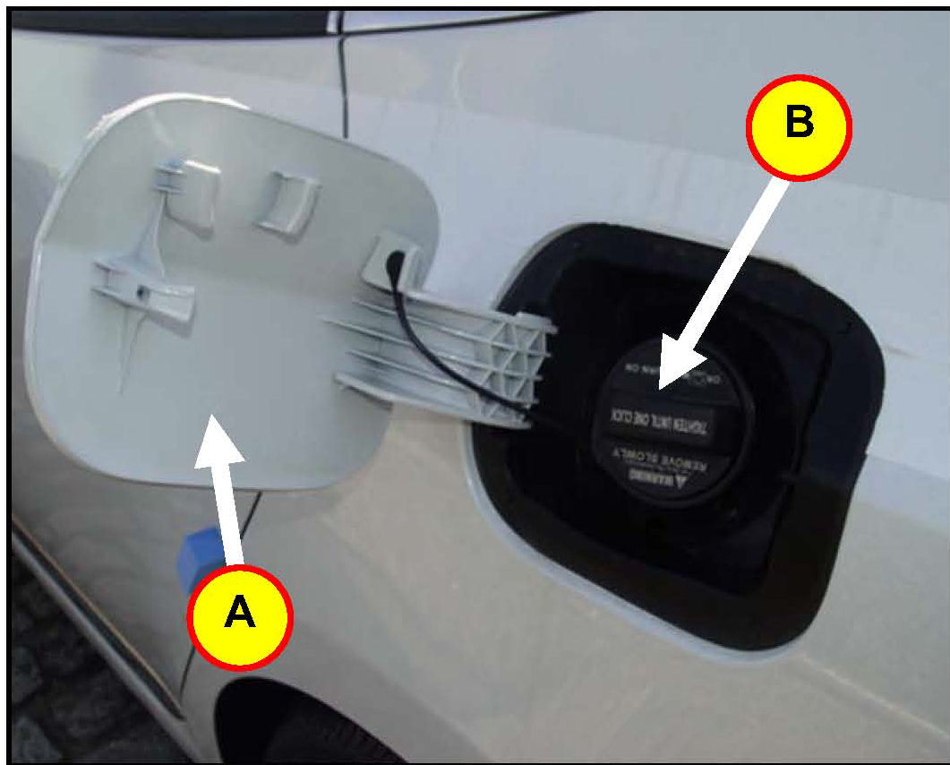 1. Push the fuel tiller door release button on the driver's door and open the fuel filler door (A). Remove the fuel filler cap (B) and place on the fuel cap holder.