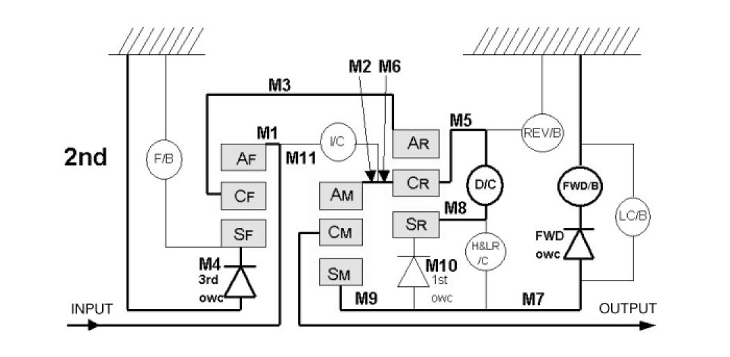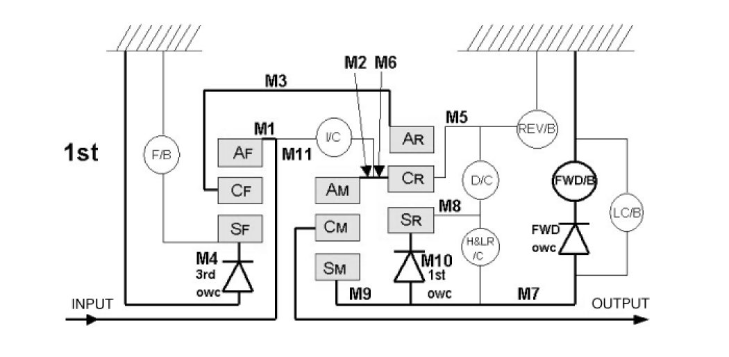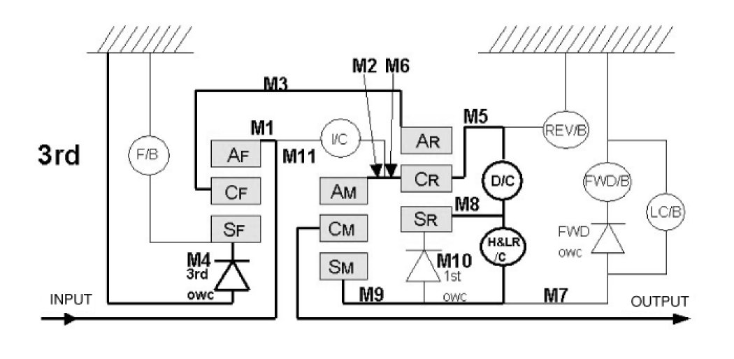 Input shaft->Front internal gear->Front carrier->Rear internal gear->Rear carrier->Middle internal gear-> Middle carrier->Output shaft