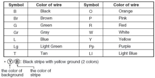 The following abbreviations are used to identify wire colors in the circuit schematics.