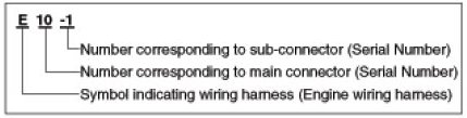 A Connector identification symbol consists of a wiring harness location classification symbol corresponding to a wiring harness location and number corresponding to the connector.