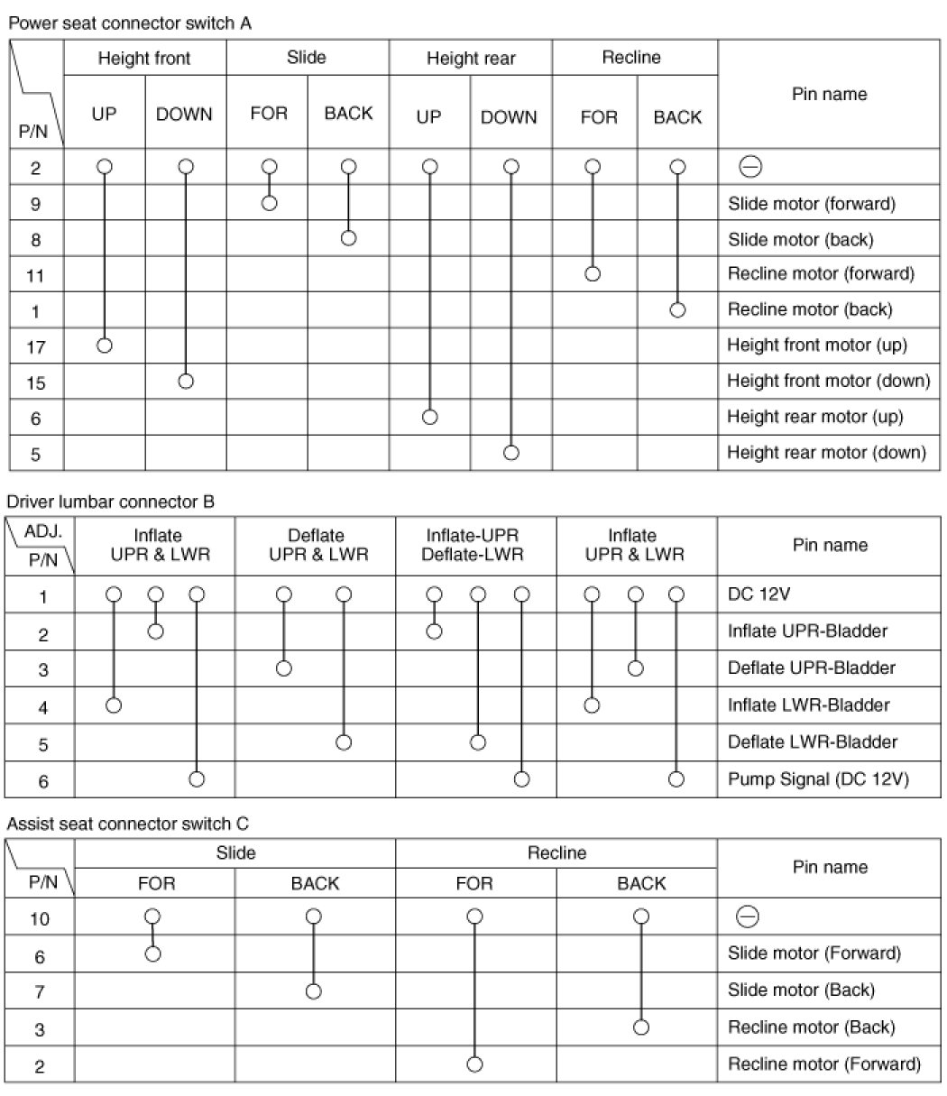 2. With the power seat control switch in each position, make sure that continuity exists between the terminals below. If continuity is not as specified, replace the power seat control switch.