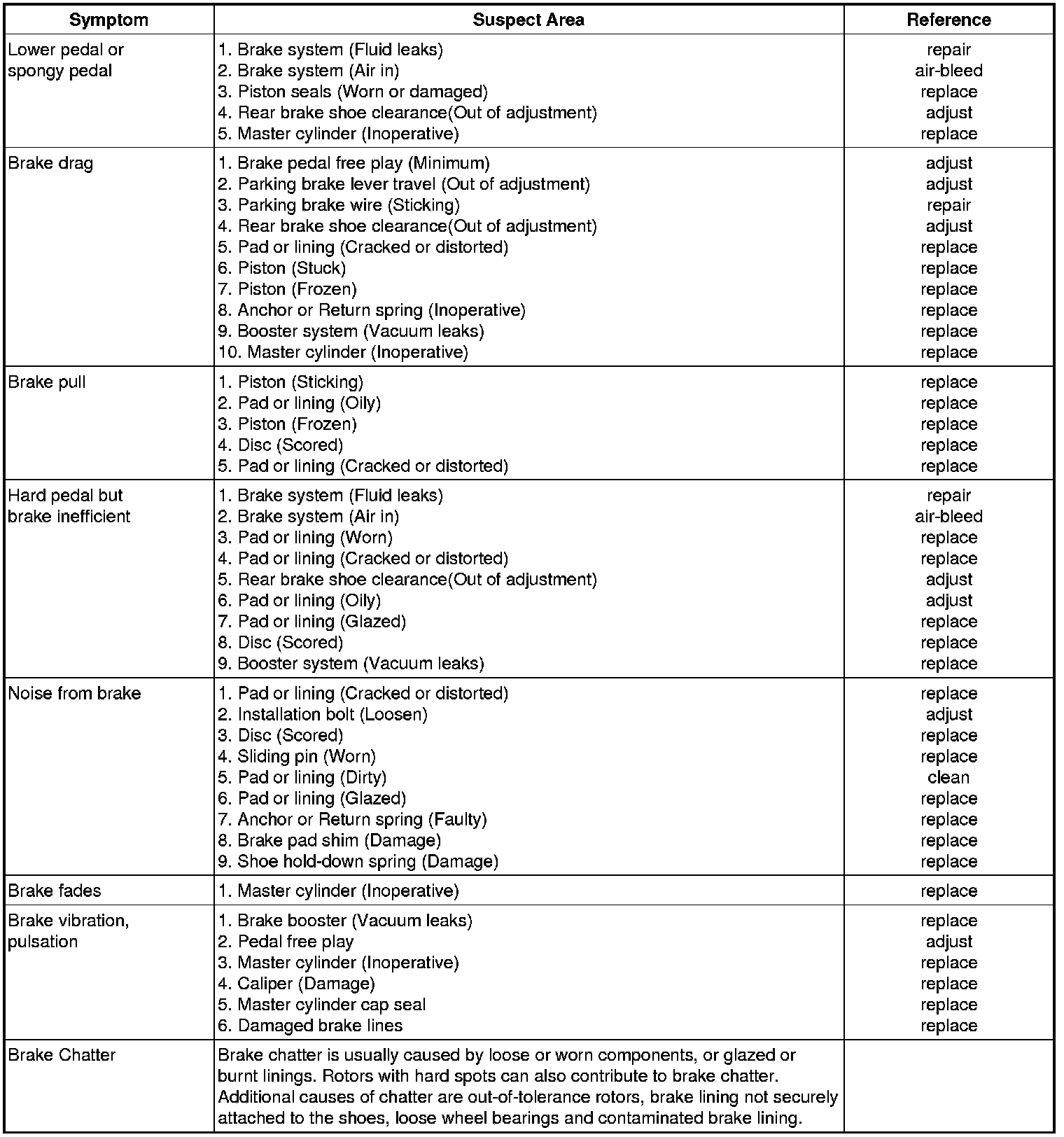 Problem Symptoms Table