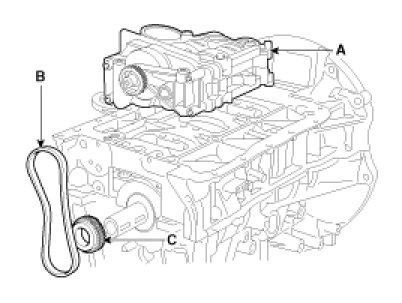 3. Install the balance shaft & oil pump module (A) with the chain (B) and the sprocket (C).
